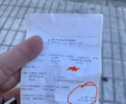 Never withdraw money from these ATMs. I have never seen such impudence and an unrealistically ... Ще Never withdraw money from these ATMs. I have never seen such impudence and an unrealistically large hidden commission anywhere. The commission was indicated as 5 euros, as a result, 17 were withdrawn, the exchange rate to the dollar was 0.7, instead of 0.9. Withdrawing 500 euros I lost 40 euros. They are scammers